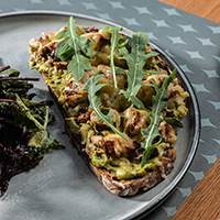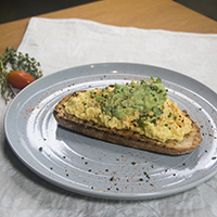 Poached eggs served on country bread and avocado mix, coated with Hollandaise sauce
