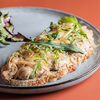 Foamy scrambled eggs with seared mushroom on country toast, black truffle flavored,served with side fresh salad
