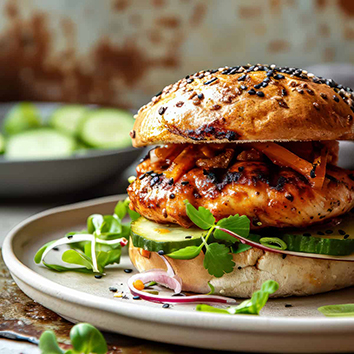 Pain brioche, chicken breasts, garlic mayo, lettuce, mushroom, pickles served with side salad and fries
