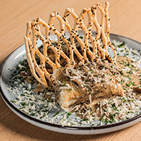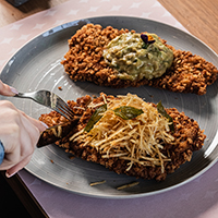 Crispy Mediterranean chicken glazed with wild herbs salsa