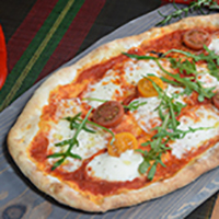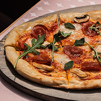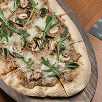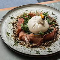 Fresh burrata on layers of Parma ham, baby rocca, olive oil and crushed black pepper, mushroom salsa