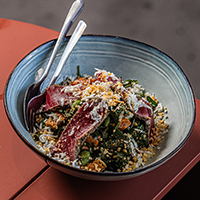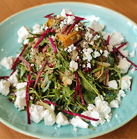 Rocca, fresh thyme, roasted pumpkin, frikeh, beetroot, avocado, almond, feta cheese, pomegranate, honey balsamic dressing