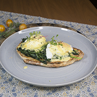 Poached eggs and spinach saute served on country toast, coated with Hollandaise sauce