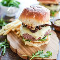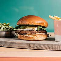 Pain brioche, steak hache, creamy barbecue sauce, baby rocca, served with side salad and fries