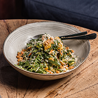 Kale, baby rocca, smoked salmon, avocado, citrus, carrots, spring onions, cilantro leaves, parmesan cheese, salted peanut and spicy cilantro dressing