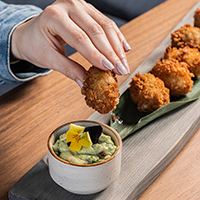 Freshly breaded crispy halloumi topped with tomato and avocado salsa