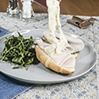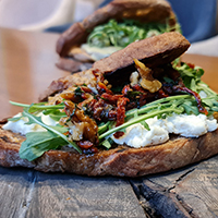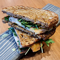 Toasted country bread filled with grilled turkey slices, melted gruyere cheese, honey mustard and baby rocca