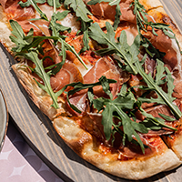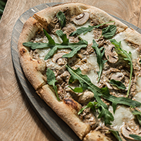 Fresh burrata on layers of Parma ham, baby rocca, olive oil and crushed black pepper, mushroom salsa