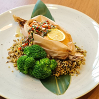 Wine flavored baked salmon glazed with ginger herbs salsa, served with cauliflower and broccoli rice