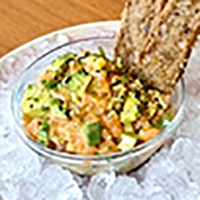 Fresh exotic salmon tartar served on crushed ice with mango, chives, avocado and spring ogions, sweet citrus sauce