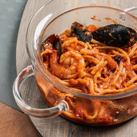 Hot pot of linguini with white wine tomato sauce, pan seared sea food and parmesan cheese