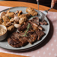 Cooked to perfection, glazed with garlic butter, served with roasted mini potatoes, mushroom and garlic, rosemary flavored