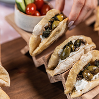 3 mini Zaatar mana'ish filled with labneh, served with olives and vegetables
