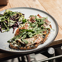 Toasted country bread filled with slices of Parma ham, shaved parmesan cheese, cornichon, pesto wild herbs and baby rocca