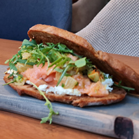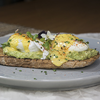 Poached eggs served on country bread and avocado mix, coated with Hollandaise sauce