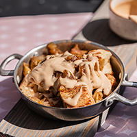 French toast with caramelized apple, cinnamon caramel sauce and vanilla ice cream