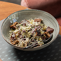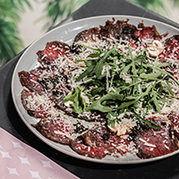 Thin layers of cured beef carpacio topped with shaved parmesan cheese, baby rocca, and black truffle sauce