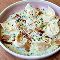 Fresh ravioli with creamy pesto sauce, parmesan cheese and bread crumble