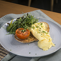 Foamy scrambled eggs on country toast served with thyme, crumble, tomato and side salad