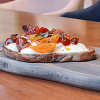 Toasted country bread topped with stracciatella cheese and trio cherry tomato salsa