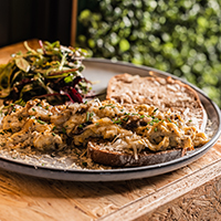 Foamy scrambled eggs with seared mushroom on country toast, black truffle flavored,served with side fresh salad