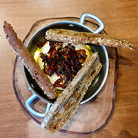 Warm brie gratin with sun dried tomato salsa, served with crispy cereal bread