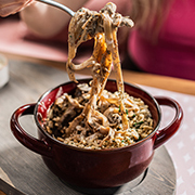 Hot pot of chicken tagliatelli, creamy wild mushroom and truffle sauce with parmesan cheese